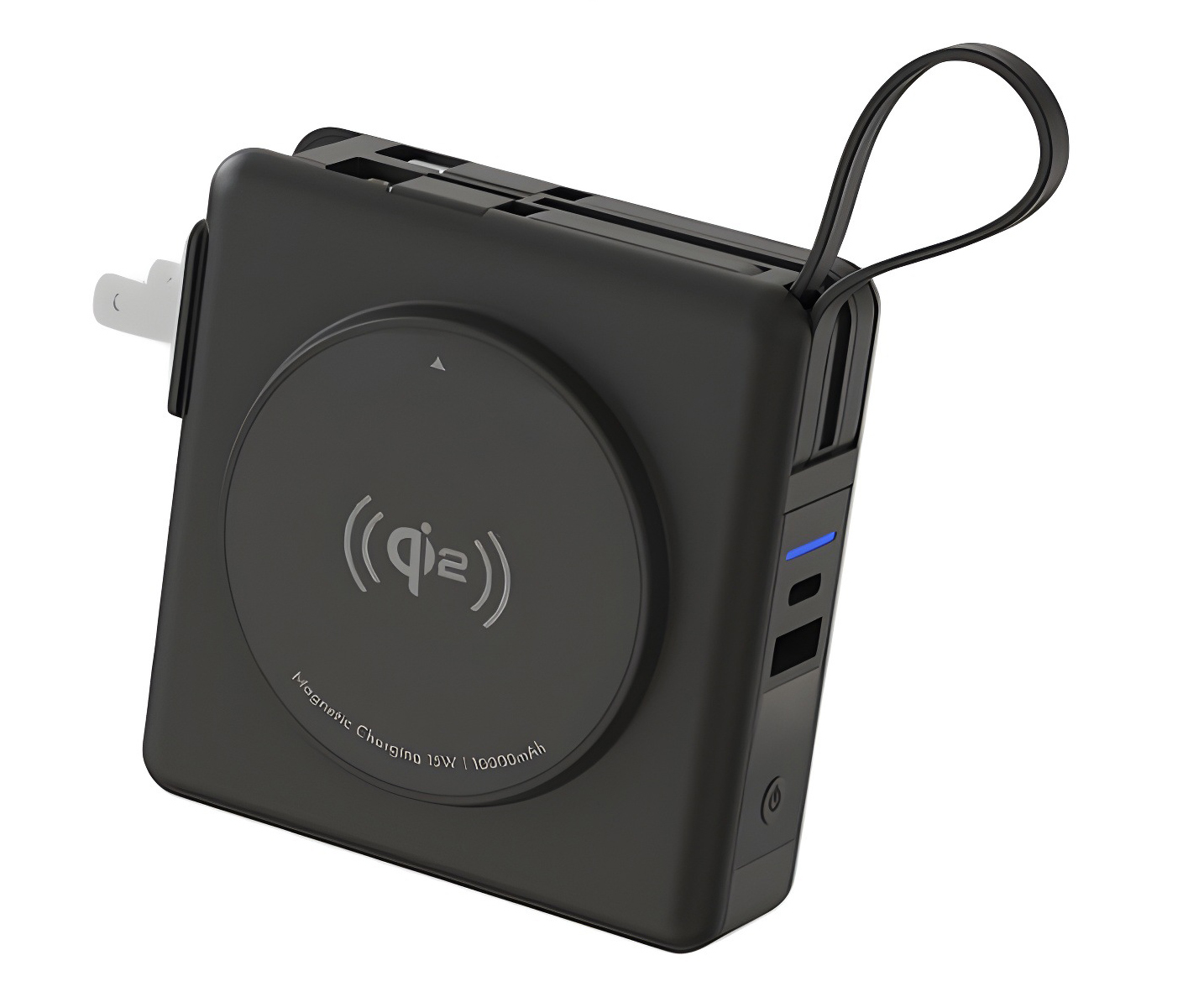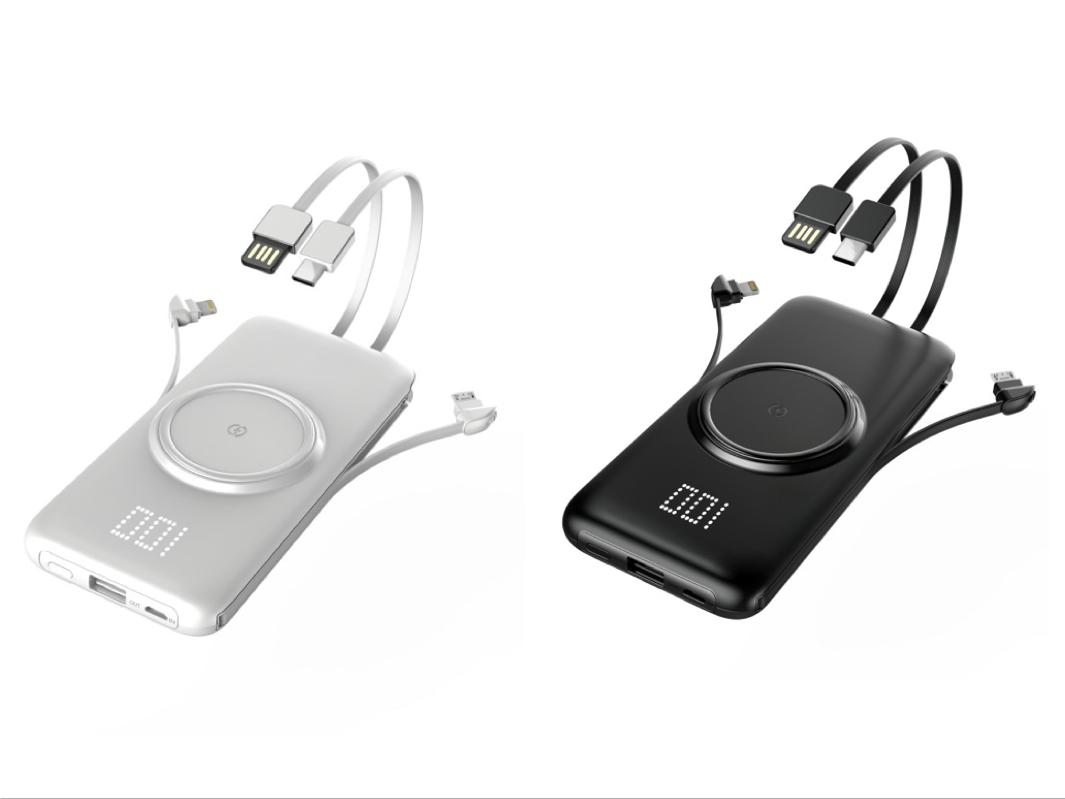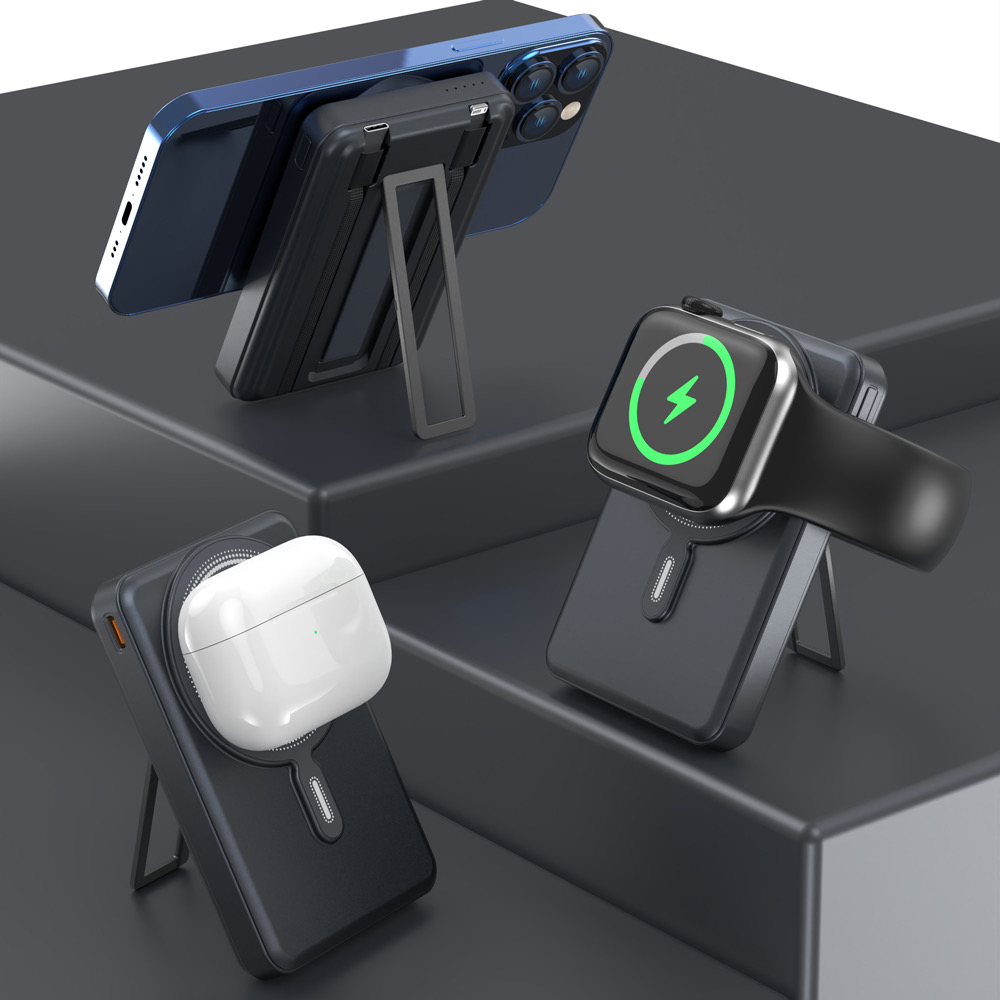 Qi2 wireless charging + power bank + built in cable / plug + mobile stand